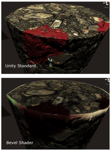 }Below is a version of this Bevel shader that uses a Bump Map. I use edge detection to mask some seams with vertex colour. Vertex colour Alpha and Texture alpha is used as smoothness - that is why the second image has different gloss, but textures and meshes in both examples are the same. The light model (formula for reflected light & brightness) is also a bit different - just an artistic choice, not related to beveling.